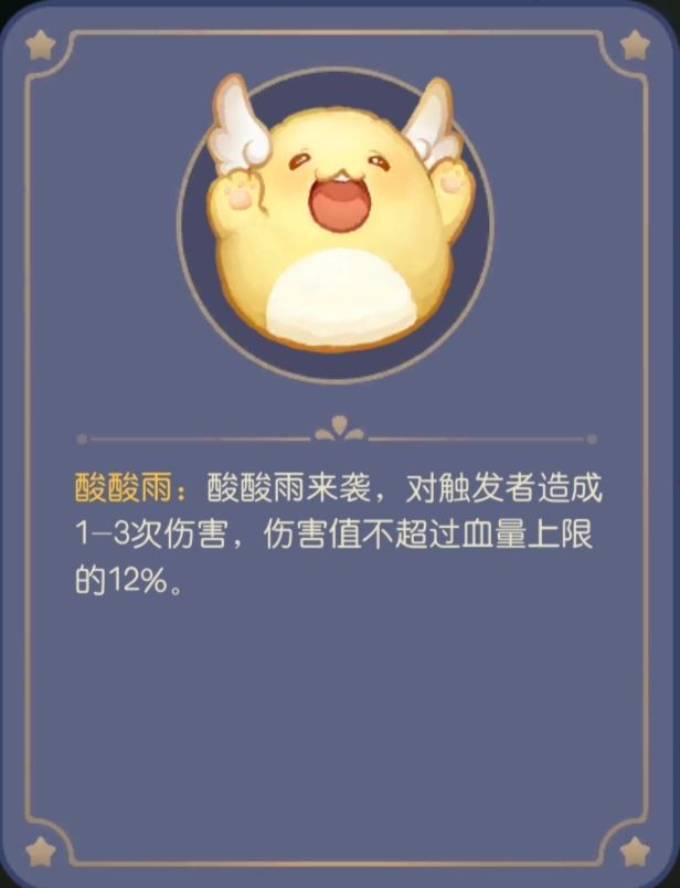 雷水水 → 【酸酸雨】:造成1~3次伤害,每次伤害值不超过血量上限的12%。