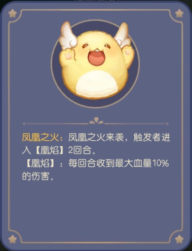 水火火→【凤凰之火】:触发“凰焰”效果两回合(每回合造成最大血量10%的伤害)。