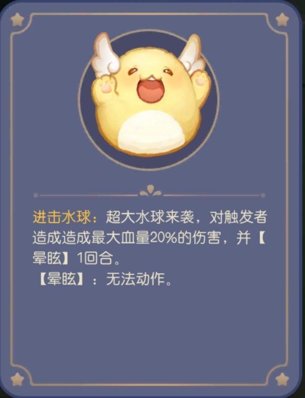 水水水→【进击水球】:造成最大血量20%的伤害,并触发“眩晕”效果一回合。