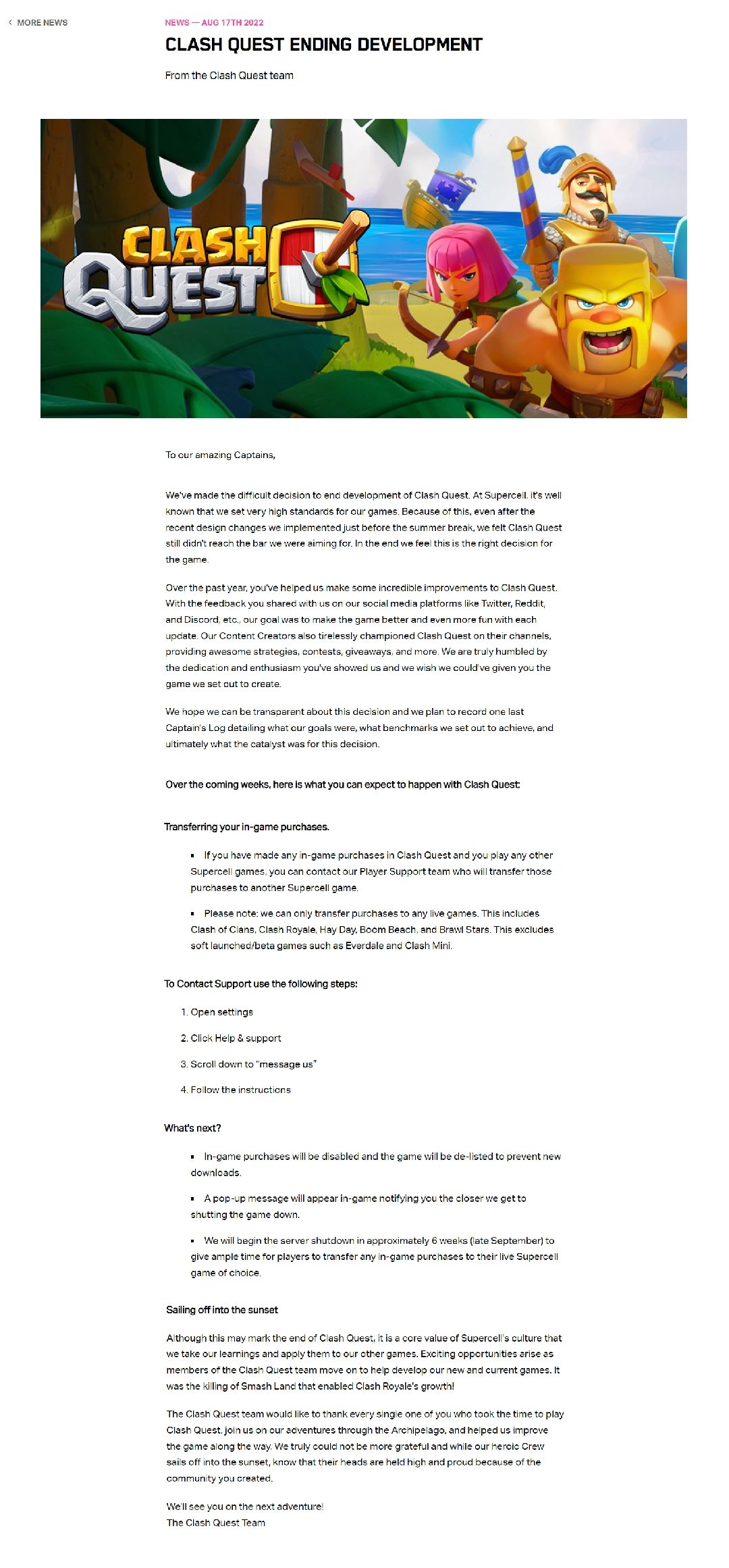 翻译: 致我们了不起的船长们, 我们做出了一个艰难的决定,要结束《部落战线》的运营。在Supercell,众所周知,我们为游戏设定了非常高的标准。正因为如此,即使在我们刚刚在暑假前实施了最近的设计更改之后,我们觉得《部落战线》仍然没有达到我们想要的标准。最后,我们觉得这是游戏的正确决定。