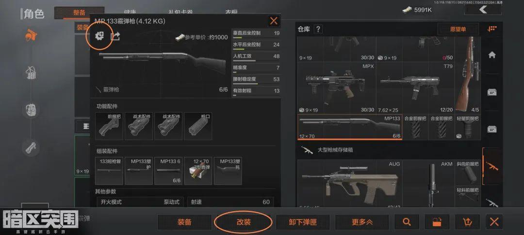 老皮:除了通过大厅进入改枪界面之外,先锋们还有2种方法可以快速开始改枪。一是在角色仓库界面选中枪械后,点击下方的“改装”按钮;二是在枪械详情页点击左上角的“齿轮加号”按钮。两者都可以针对当前枪械进行快速改装。
