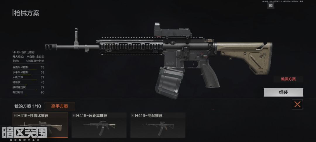 当进入改枪界面后,我们可以看到左上角有一个“枪械方案”按钮,这里有先锋们之前保存的枪械改装方案(如果有保存的话)以及系统推荐的高手改枪方案,选中心仪的方案后再点击“组装”就可以快速改枪了。