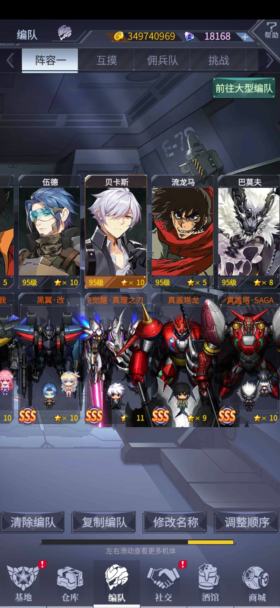 以上是我的队伍和手头的几个九星机体,但是还是在43关开始碰的头破血流,请教我该怎么搭配才行?机师基本都有了,除了一些活动机师,基本热门都有。请大佬指教。另外,我这个状态,是不是最好还要抽传说中的泥头车,三神机之类才行?配件必须满九十级?