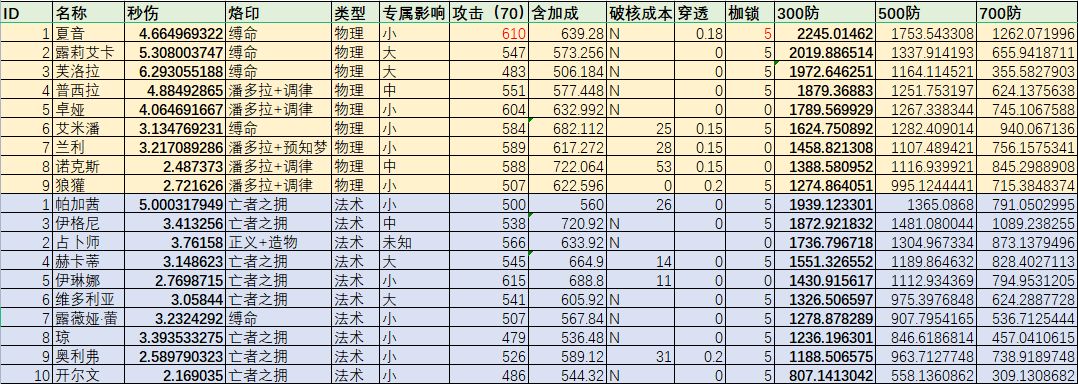 声明:物理队计算时默认有诺克斯27%+魂之裂痕12%=35.76%减防;法术队默认有赫卡蒂18%+琼30%=42.6%减防。所有叠加buff直接叠满,所以需要暖机的角色实际会稍弱。单次非永久技能不进行计算。狂级角色除夏音外都以0枷锁计算,其他角色统一5枷锁计算。攻击力取角色70级时的数据,标红的是我估算的(因为没有该角色)。所有数据只计算单体伤害,范围伤害自己脑补增强。该榜单按怪物300防御时的数据排名,包含所有精准及异能角色和3个常用狂暴角色。