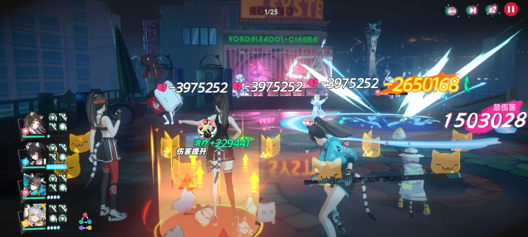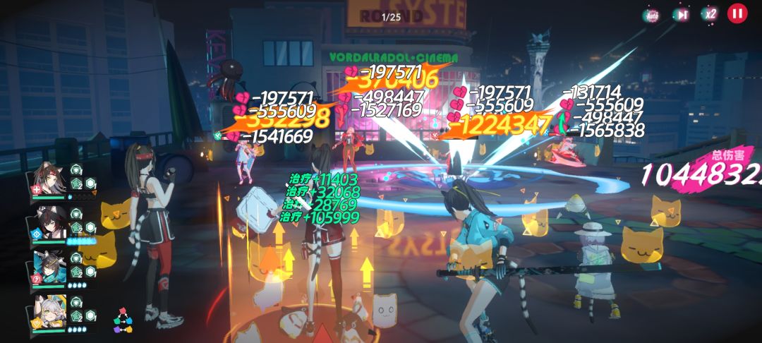 分享一个夜巡快速刷,buff尽量选开局加sp的,一号位加攻二号位企鹅带散射开局大直接秒,因为企鹅的大其实是单体伤害剩下都是额外的,搭散射简直无敌了,小关全都是一回合过,运气好点第一个boss之后就凑齐了