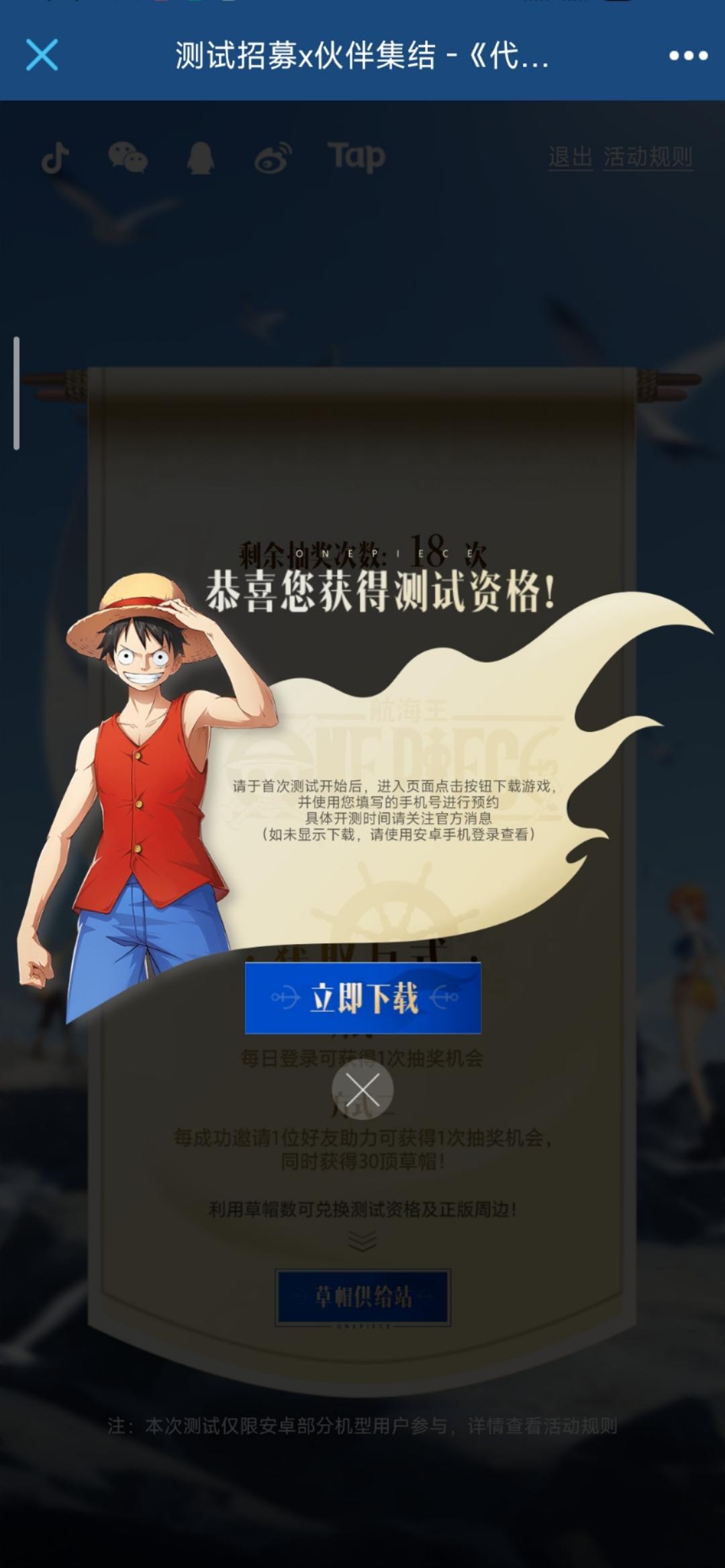 第二种,预约获得内测资格,链接如下。 大家点进去,先预约才有兑换的资格,做任务获取草帽,集齐40草帽,兑换资格!