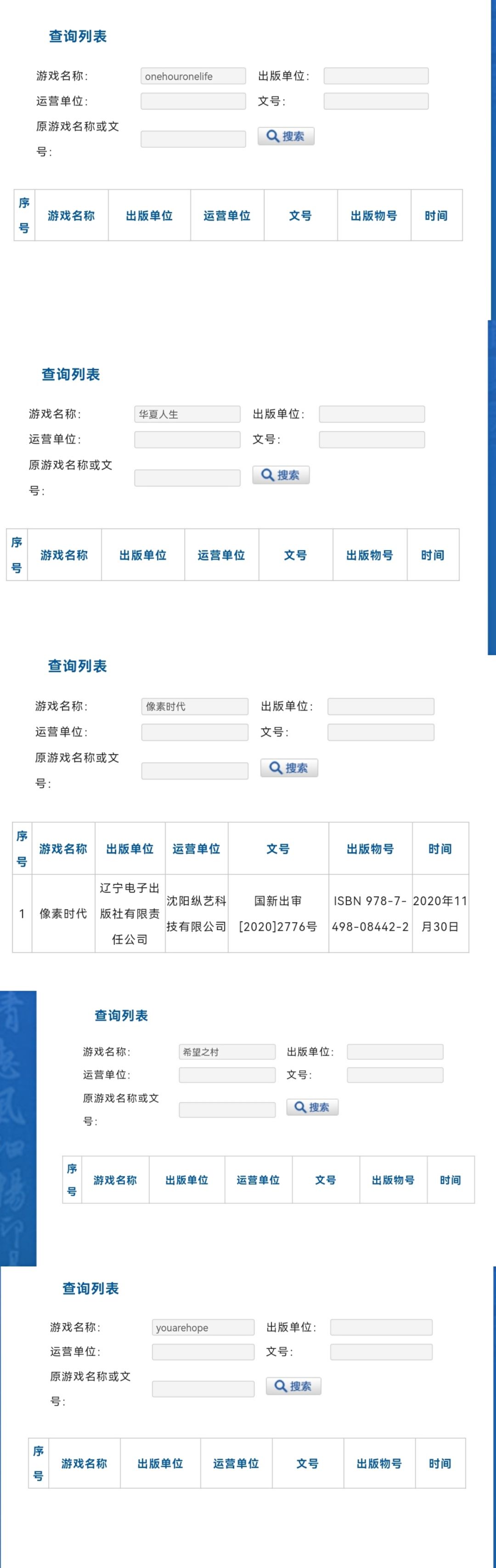 无意之间上网查了一下,发现希望之村从开服到现在,从一小时人生到希望之村,几年来,都没有通过版号审核。目前,只有换皮游戏像素时代,才于去年通过了版号。