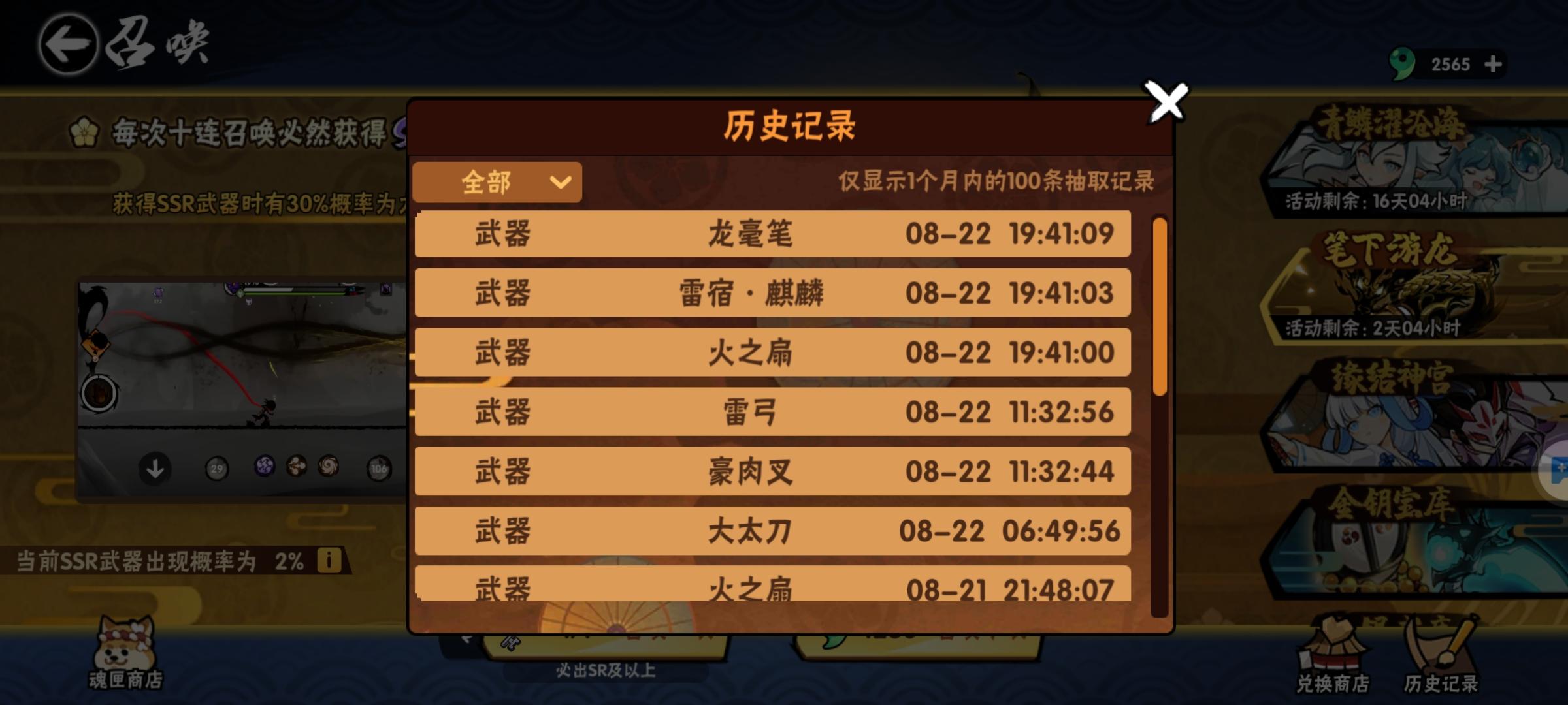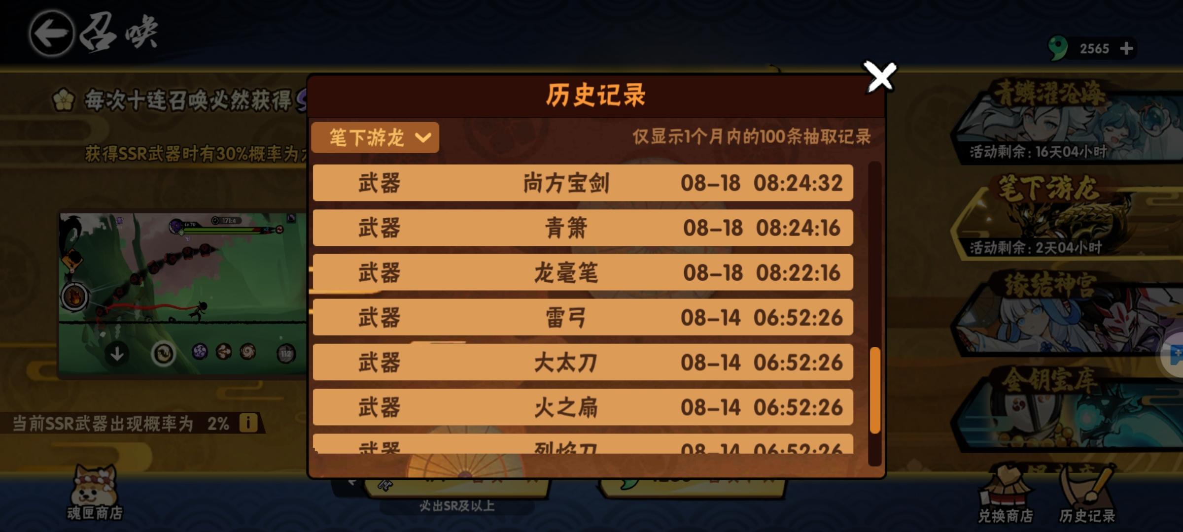 毛笔池子第一天出毛笔幻化,5号出原皮,18号出咒印,22号周年宝库出两金。