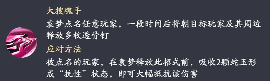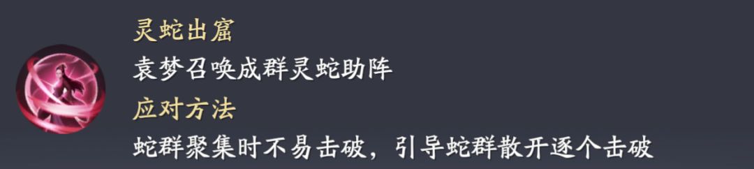 这个技能BOSS会召唤两批蛇群,除了拉BOSS仇恨的玩家之外,剩余玩家要分散击杀蛇群,并且每人最多吃2次蛇玉。【灵蛇出窟】技能完成之后BOSS会继续释放【毒雾方阵】,所以,在时间紧迫的情况下,可以放弃吃玉,玩家吃1个蛇玉也可以。