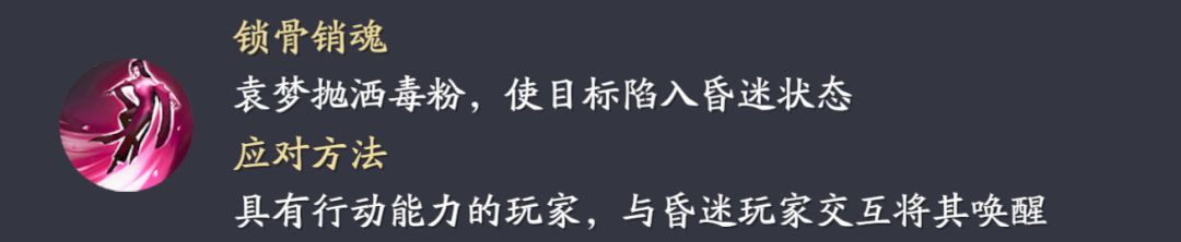 这个技能,也非常的容易,但是要注意的是这个技能后面BOSS会在玩家的脚底释放【毒雾方阵】。所以,当BOSS释放【锁骨销魂】的时候,大家第一时间要去唤醒中了技能的队友,必要的时候可以放缓输出。