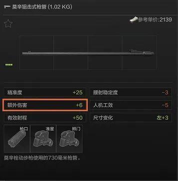 接下来再看看测试环境和条件,测试枪械选用莫辛纳甘栓动步枪,并加装莫辛狙击式枪管,该枪管可以额外增加6点伤害。
