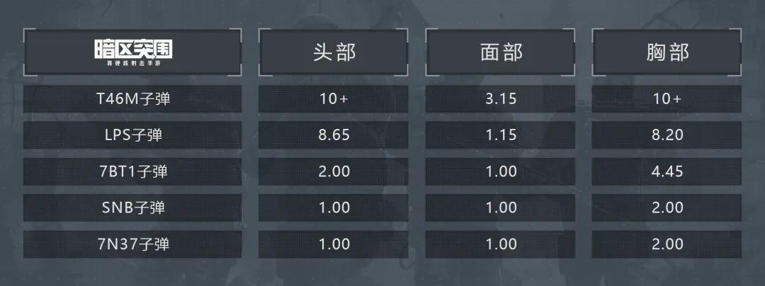 针对顶级防具时,高级子弹的优势更为明显。SNB子弹和7N37子弹的伤害表现并列第一,在攻击头部和4级防护的面部时都只需要一枪,胸部则为两枪。而5级穿透的7BT1子弹除了能稳定击穿面罩之外,攻击其他部位的效果则略显乏力。剩下的T46M子弹和LPS子弹由于难以穿透防具,效果都不太理想。