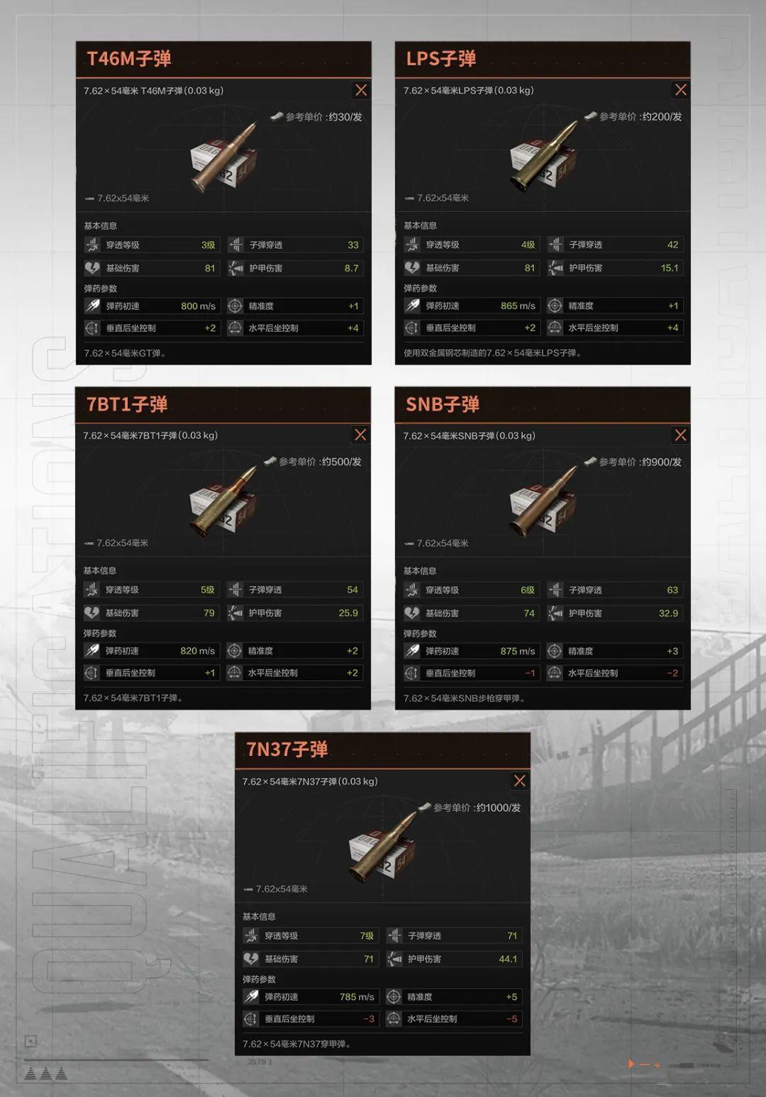 首先我们来了解一下今天测试对象的基础信息,目前7.62x54毫米口径的子弹共有5款,可适用于栓动步枪莫辛纳甘和射手步枪SVDS两把武器。它们的基础属性如下: