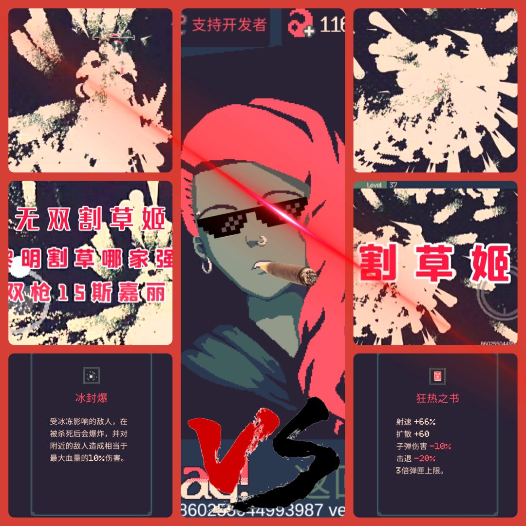总结:开局引怪,配合冰 火 瞄准 强力射击,然后选择“散射之书”“力量之书”长按轮盘转圈射击,就可完成无双割草