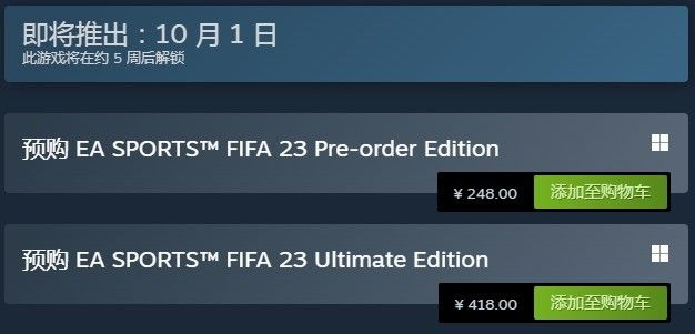 之前《FIFA 23》Steam国区售价进行了调整,标准版售价由288元下调为248元,终极版售价由418元下调为338元。