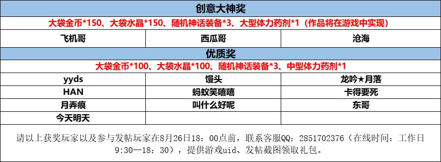 非常感谢大家积极参与装备设计大赛活动,我们会在下个版本将选中的作品在游戏中实现,恭喜三位创意大神!此外,所有参赛的玩家抓紧时间来领取你的奖励哦!