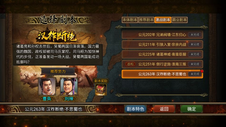 本次即将开启的是第五个激战剧本——“汉祚断绝·不思蜀也”