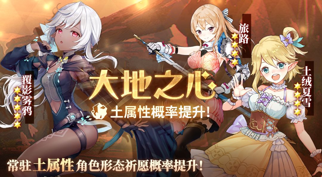 「大地之心」常驻角色形态祈愿即将开启,活动期间内,常驻5★角色形态「覆影雾鸦(土)」以及4★角色形态「旅路(土)」、「土绒夏雪(土)」的祈愿获取概率会大幅提高!