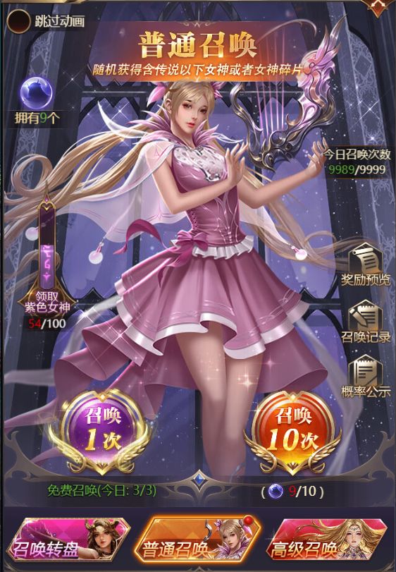 1.召唤召唤分为普通召唤和高级召唤,普通召唤能够获得蓝色和紫色的女神,而高级召唤能够得到紫色女神和橙色女神,甚至一些欧皇玩家可以得到最珍稀的红色女神。