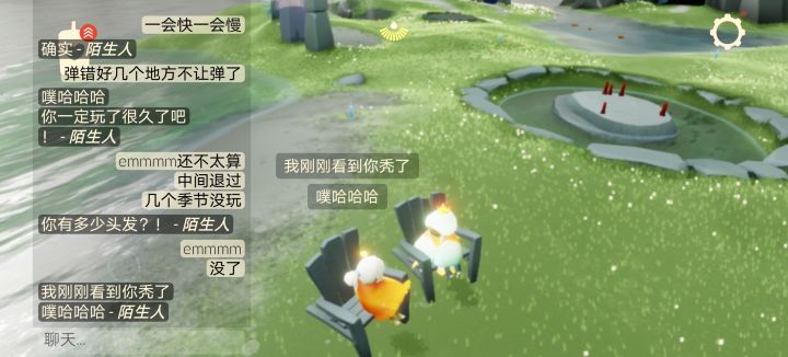 emmm遇见个笑点很低的小黑,我就在试着弹光遇先祖琴谱,然后小黑过来也不吵也不闹,我跟她点火后拿椅子坐下聊天,她问我做啥,我说了之后她就哈哈大笑,她接下问的什么你们看图片也知道了,我就给她看我有多少,我玩的时间不长,中间几个季节都没玩过,发型也是很少,但是她说了一句:你中间秃了,我很疑惑,哪个发型秃了?还一直笑,是这个吗(我没买禁阁先祖的发型)最后说着说着,串了😐