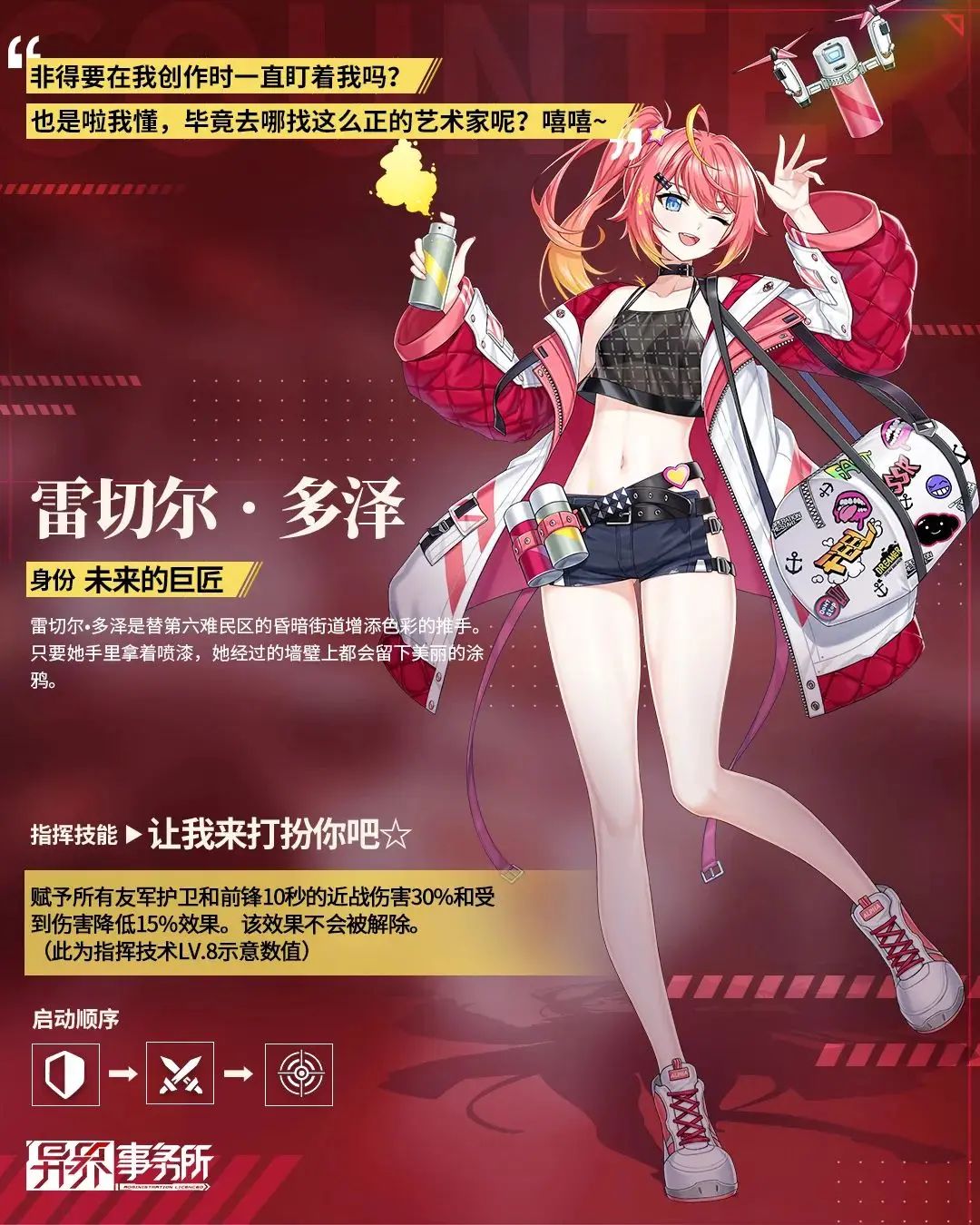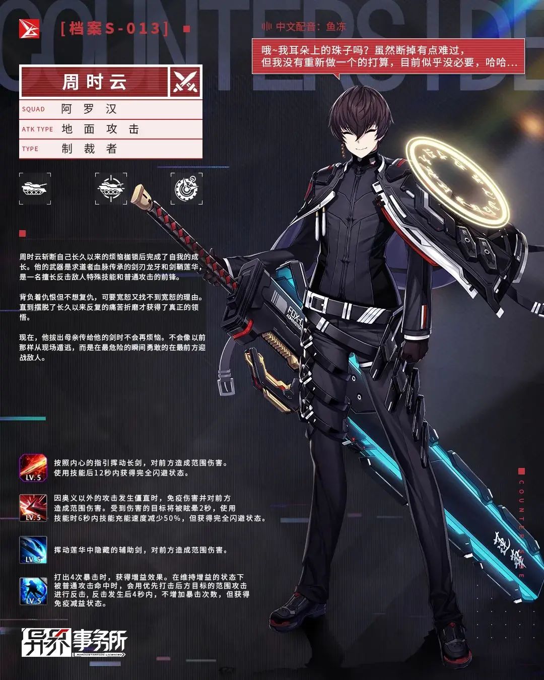 斩断了长久以来的烦恼,以觉醒姿态登场的周时云。刀锋刃影挽出层层的剑影莲华。本周四更新维护后,觉醒角色“阿罗汉·周时云”的秘密雇佣概率UP复刻卡池开放。阿罗汉·周时云是一名擅长反击敌人特殊技能和普通攻击的前锋,老板们可根据公司内的战备情况前往雇佣。