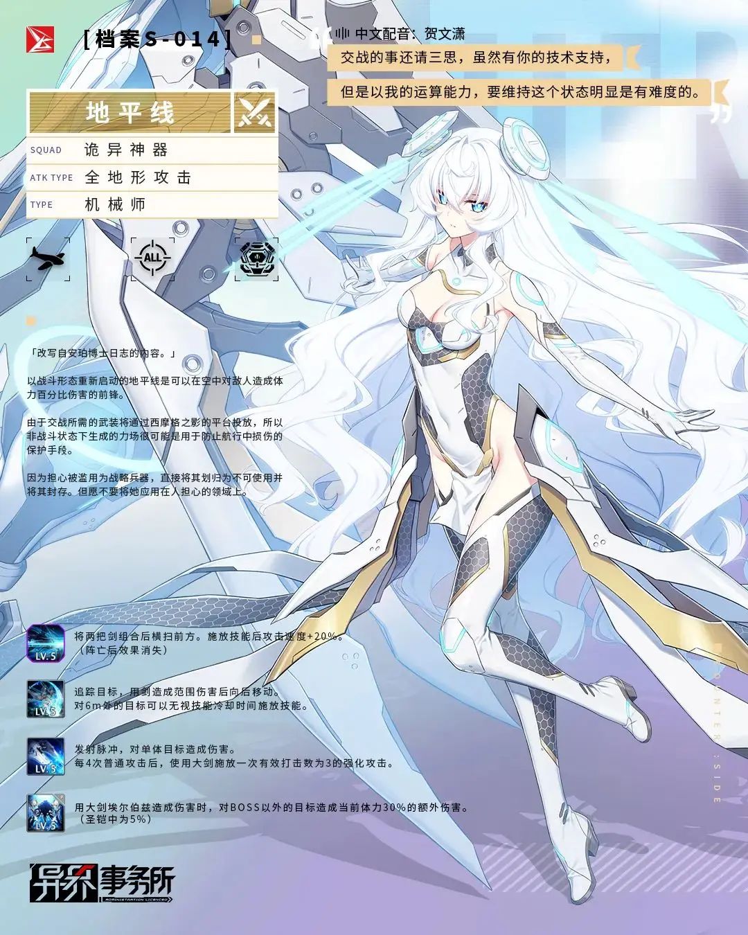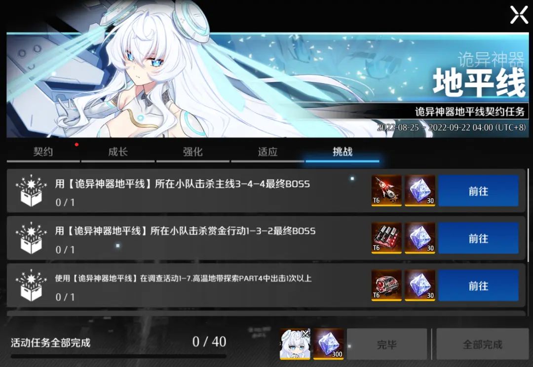 觉醒地平线是可以在空中对敌人造成体力百分比伤害的前锋。获取到该角色后,完成契约任务,将得到包括T6级机械师装备、融合核心、终身雇佣誓约书、机械师特殊适能核等在内的作战资源。完成全部的契约任务,还将得到【人偶:迷你地平线】以及钻石×300的奖励!