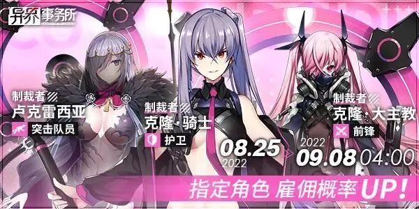 她们各自拥有一套掌控战场节奏的方法,又擅长在某个特定的时刻居高临下,俯视向她们屈服的一切。本周四更新维护后奥尔卡、卢克雷西、克隆·骑士以及克隆·大主教开放雇佣概率UP复刻卡池,老板可根据战备需要,前往雇佣。