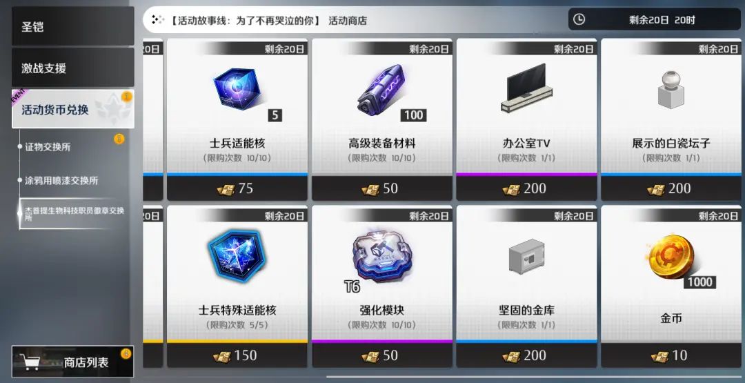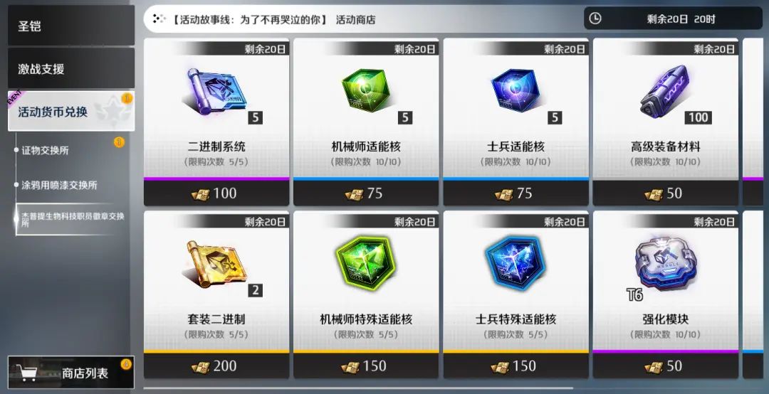 新一期的活动主题商店“杰普提生物科技职员徽章交换处”开放,收集章节道具“杰普提生物科技职员徽章”即可在商店内兑换到包括主题家具、士兵特殊适能核、机械师特殊适能核、套装二进制、二进制系统等在内的作战资源。