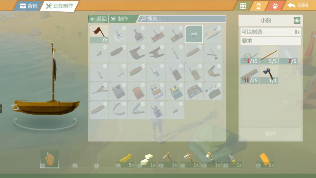 制造小船的要求为任意草绳x15+木杆x5+布x5+原木x25+任意斧头x1。