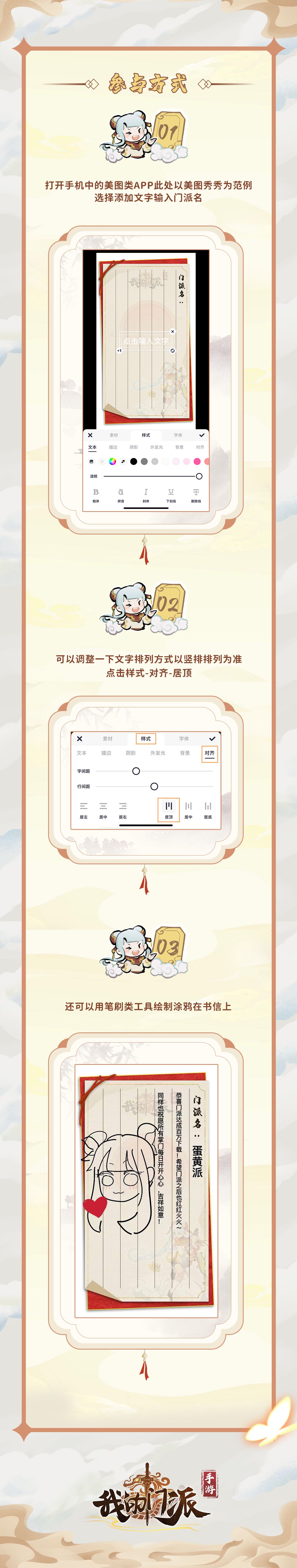 1、故事类以及绘图类内容不得抄袭、二改,且参与活动的书信需要与《我的门派》游戏相关;
