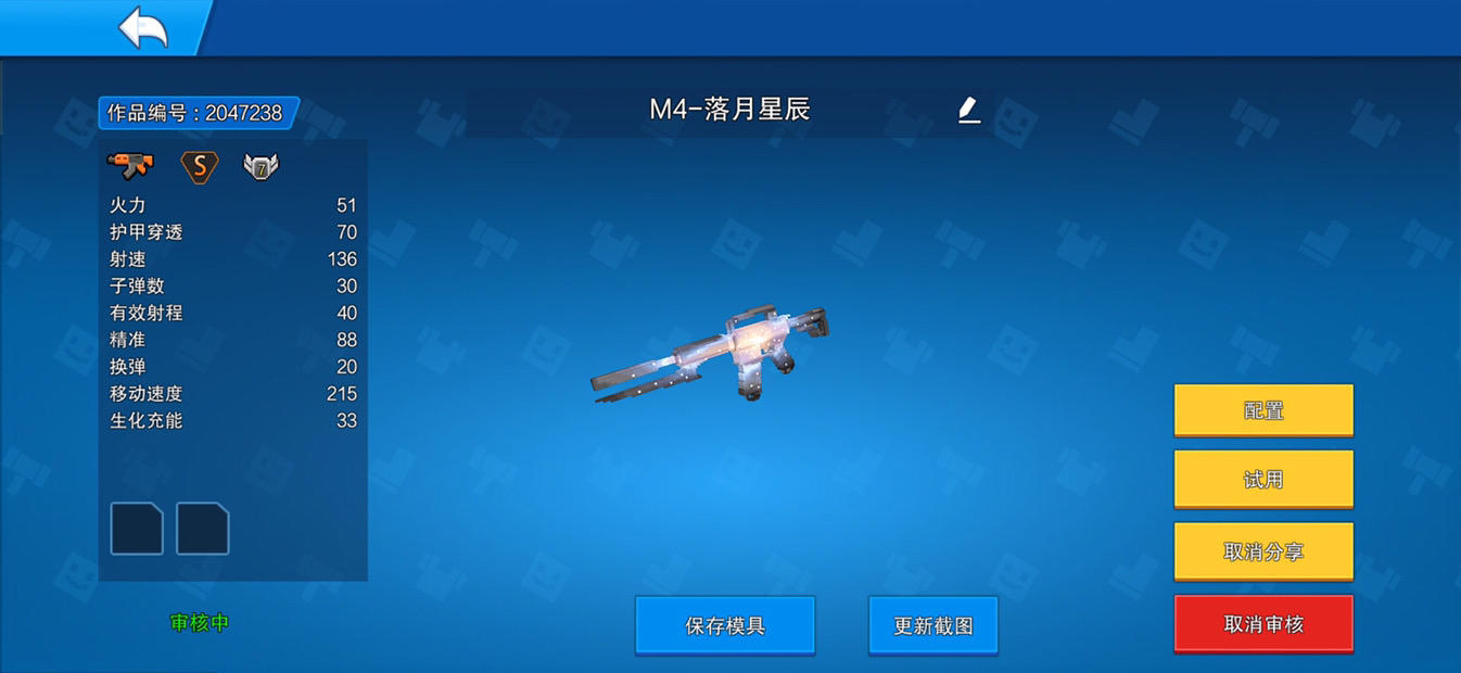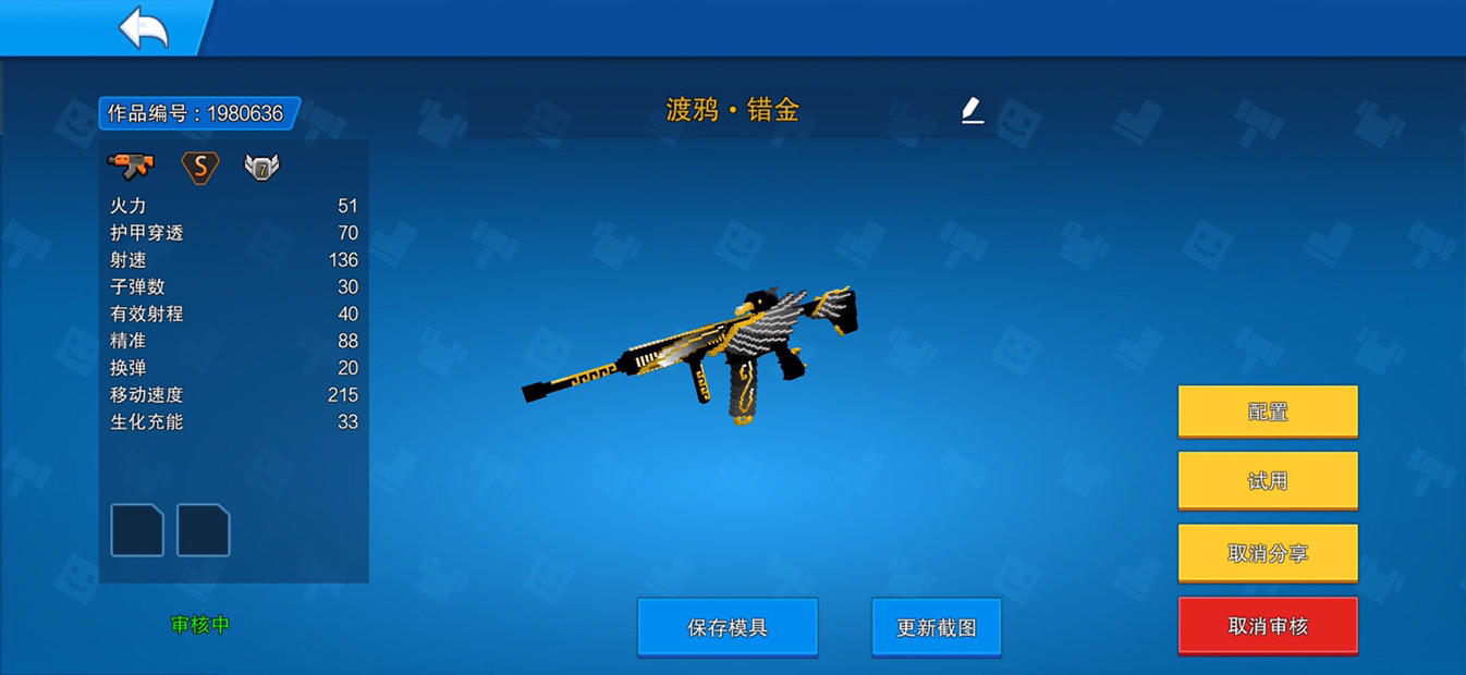 早上六点左右把三把枪提交申请,中午之前过了一把。这一把是之前没有分享过的,剩下两把是之前分享过的。那两把之前分享审核都过了,这回比那把还慢,怪捏…