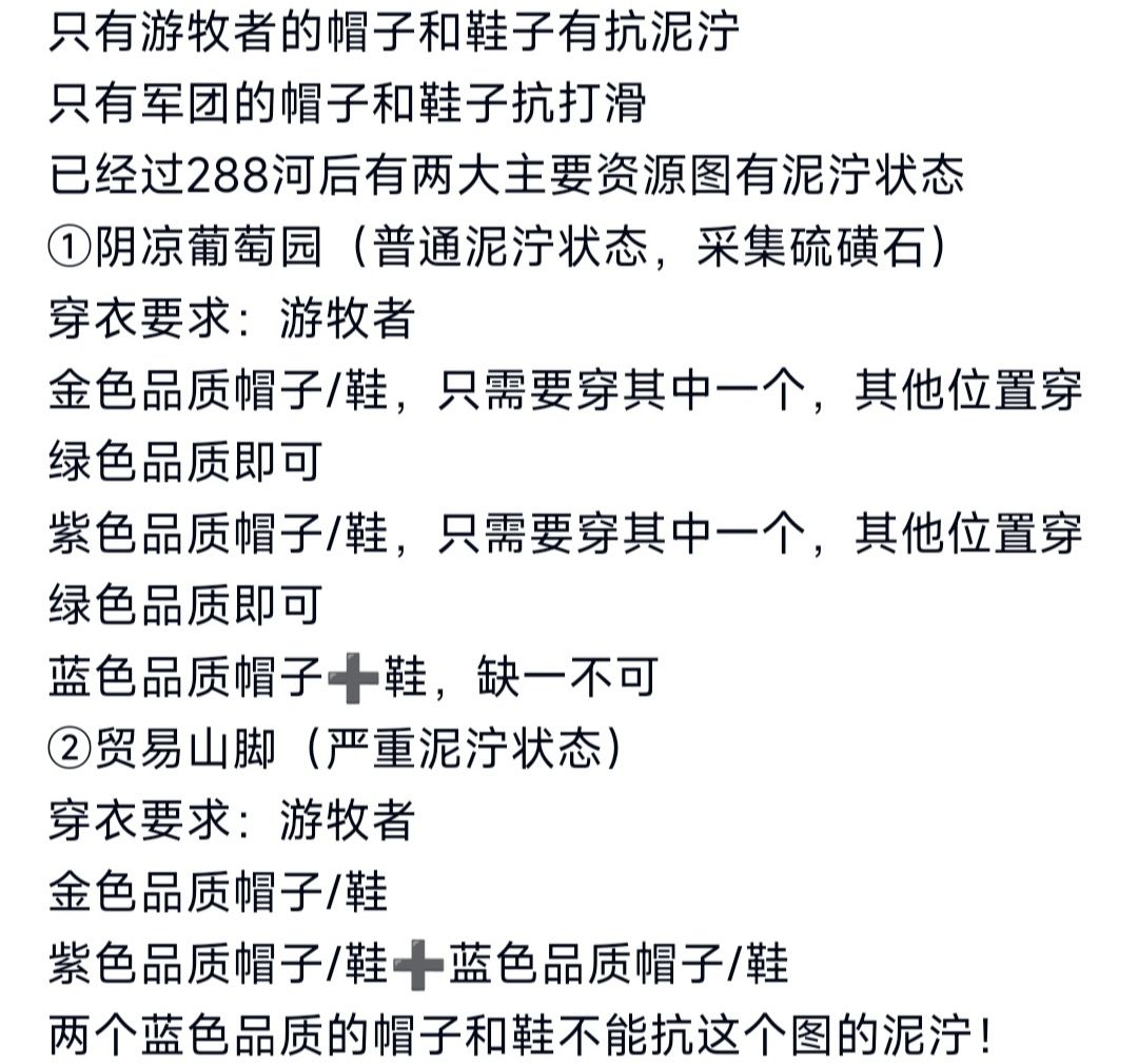 在640的地图里也有普通泥泞和严重泥泞状态,和以上的情况是一致的。如果有条件可以人手一个金帽子,跑全部泥泞不成问题,还可以穿军团的鞋加快过图速度。金色游牧帽子省着用,不跑泥泞不要用,跑泥泞的需求其实没有非常大,如果是平时打工可以两个蓝色跑普通泥泞的图,想高速过图懒得换衣服可以向衣匠寻求一个金帽子。穿小红帽抗泥泞亏到爆炸,找衣匠做游牧是最优解。