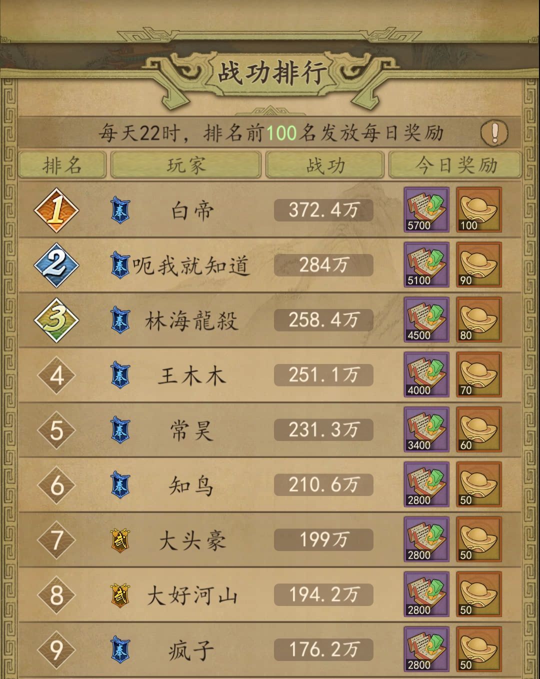 开始更新了,第五天,新的一轮战功,第一轮不出所料,小蓝只有一个战功顶了上来,其余集体低战功,小黄氪佬爆头怼了六星加两橙,进入中期。小黄的特产城刷在最弱的小蓝方向,可以做保底了。今天一整天无尿点,因为剧情是这样的,十点整,小黄没有考虑多拿一个特产城,而是向小蓝进发,通过第四天也明白结果了,小蓝不出意料顽强得进行了抵抗,持续许久,奇迹的是小黄战果很小,小蓝成功抵抗了下来并且和小黄陷入了拉锯战,逐渐,小黄想要停战了,小蓝当然也巴不得停战,但小黄人数众多,不知管理不当还是什么原因,战局一直在继续,小蓝也被迫参战,大战整整持续了13小时,小黄成功将小蓝众人送上排行榜