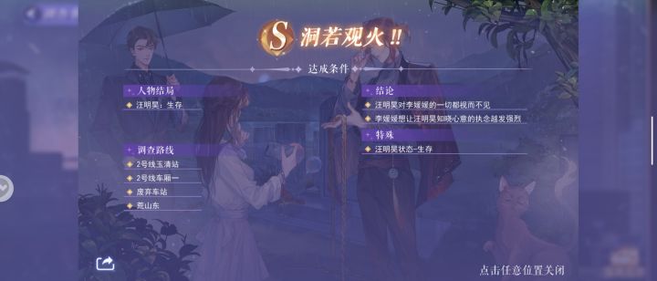 注意的点是看到汪第一件事就是救他,这样他的状态才能是【生存】,然后推理的时候,荒山东关于李的强烈执念选【情书】