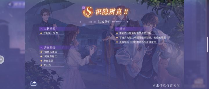 首先回溯到二号车厢2,然后通关,进去之后先调查【观察属性的那个】,然后调查丁晓月面前的男人,这样最后才能百分之百完成度