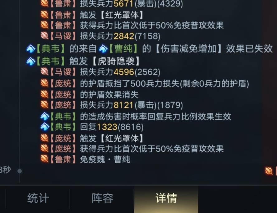 魏*曹操:麟驹【幼麟之躯】 战斗中,每隔7.5秒,有25%几率使自身回复一定兵力(回复率200%,受统率影响。