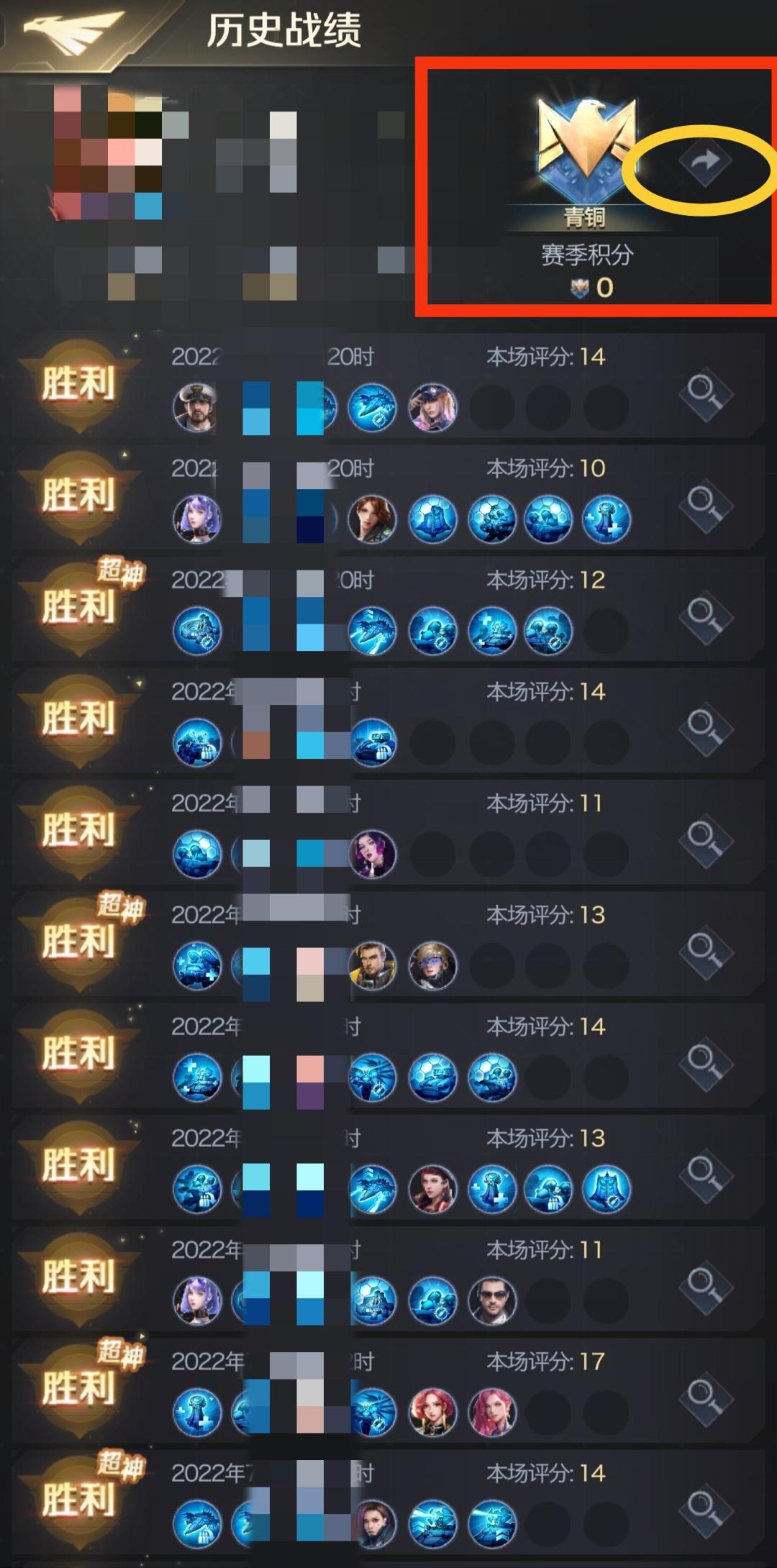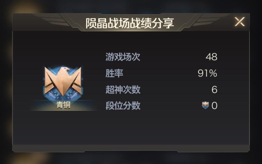 每场比赛结束后,指挥官可以通过点击历史战绩查看自己的赛季积分和所处的段位,也可以点击段位图标右上角的分享按钮将自己的陨晶战场战绩在世界频道或者联盟频道进行分享哦。