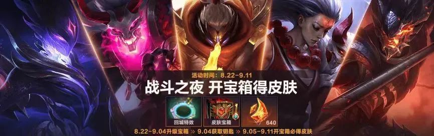 一年一度的联盟周年庆即将到来,战斗之夜预热活动抢先开启!截止9月4日,召唤师完成每日任务可获取能量升级宝箱,并获得宝箱钥匙,于9月5日至9月11日开启宝箱即可免费获得皮肤奖励,最高可获得史诗级皮肤!