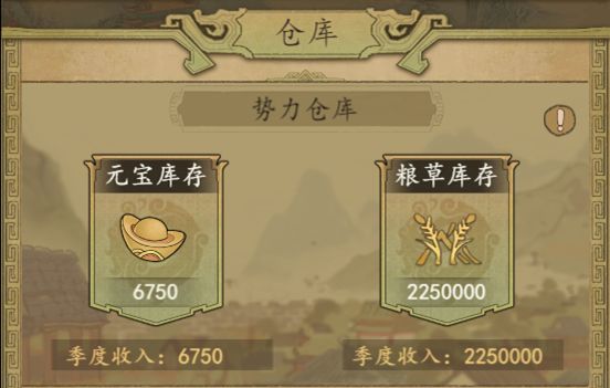 2、每个季度22点,属于本势力的城池会将税金和税粮将存入到势力仓库。玩家充值及购买各种礼包的时也会产生部分元宝进入到势力仓库。