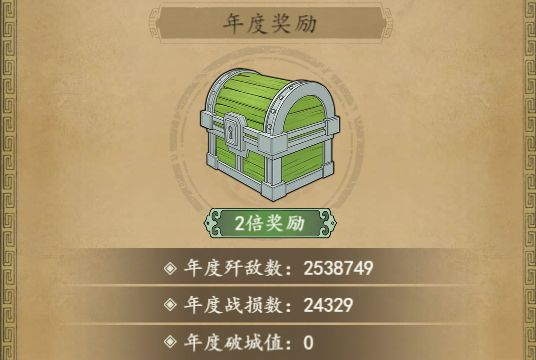 3、每年冬季23点结算个人年度奖励,该奖励不累计。将势力仓库内所有元宝,分发给势力有年度奖励的成员,分发额度将依据势力成员在本年内的贡献高低而决定获得元宝的多与少。贡献取决于玩家的年度歼敌数、破城数、战损数等。若个人歼敌、战损及破城值过低,则本年度没有奖励。