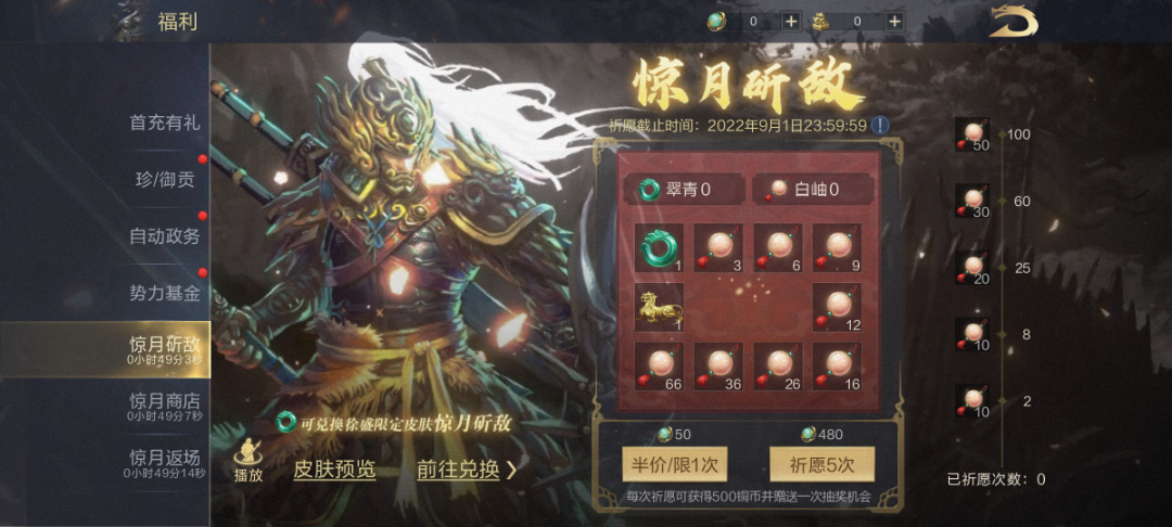 皮肤名称:惊月斫敌活动时间:8月26日 10:00:00-9月1日23:59:59活动范围:备战区及巅峰赛季