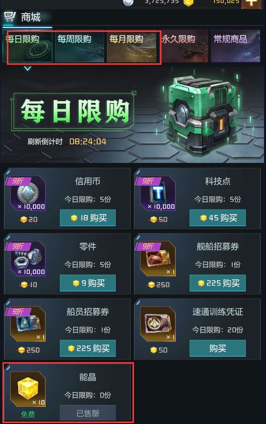 商店里可以领取每日、每周和每月的免费的能晶,对于白嫖玩家来说是非常不错的,个人而言每天也不用很肝,上线做做任务,一个周也能存到好几千的能晶,如图所示: