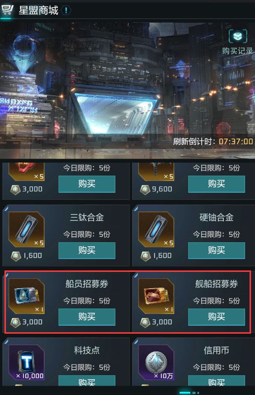 星盟的建设也建议每天都进行建设,建设会获得星盟贡献,星盟的贡献可以在星盟商店兑换船舰和船员招募券,如图所示: