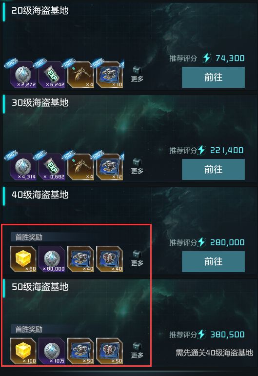 首先获得能晶可以攻打不同等级的海盗基地,不同等级的海盗首胜奖励的能晶也是不一样的呢,如图所示: