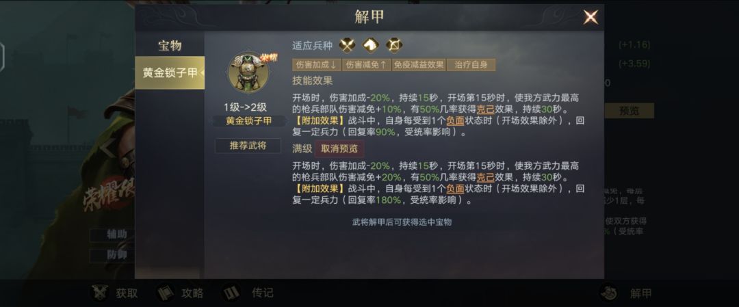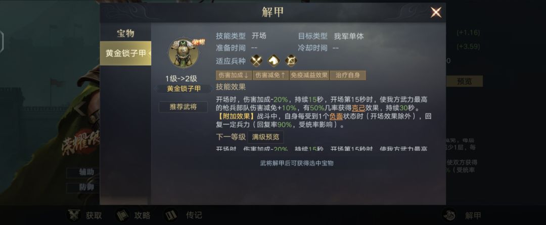 的枪兵部队伤害减免+20%,有50%几率获得克己效果,持续30秒。【附加效果】:战斗中,自身每受到一个负面状态时(开场效果除外),回复一定兵力(回复率180%,受统率影响)