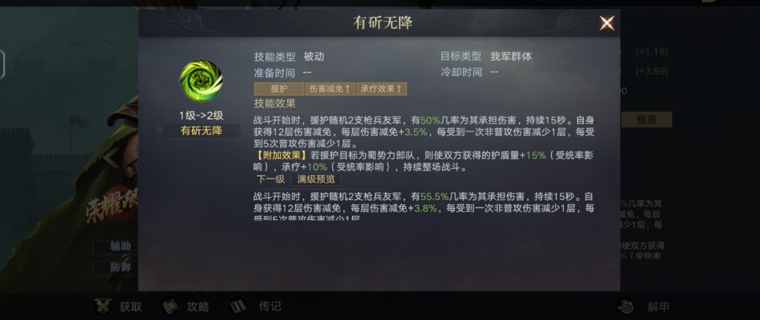 【附加效果】若援护目标为蜀势力部队,则使双方获得的护盾量+30%(受统率影 %几率响),承疗+20%(受统率影响),持续整场战斗。