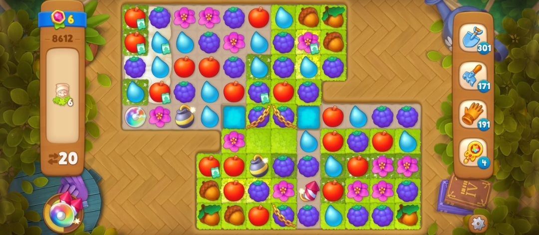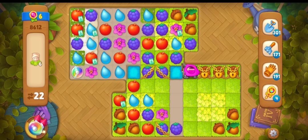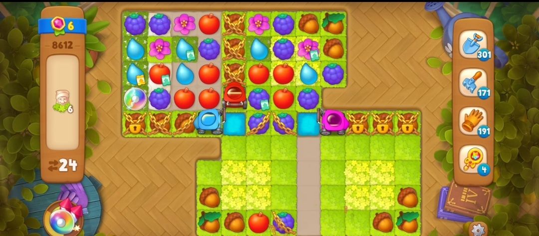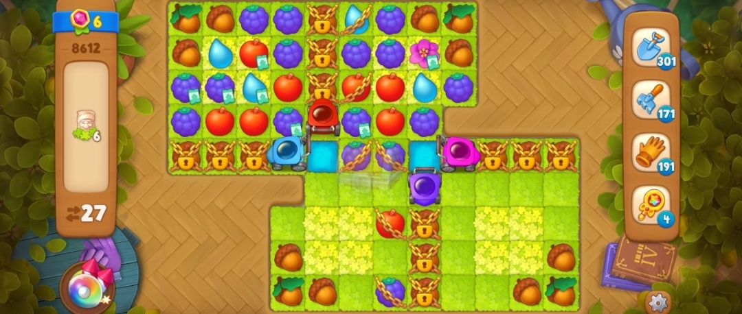②我们需要先收集一定数量的跟割草机颜色相同的元素,让割草机启动,这一关的锁链不需要自己进行消除,启动割草机就可以消除掉,比如红色割草机,就要收集足够数量的红色苹果元素,就可以启动割草机。