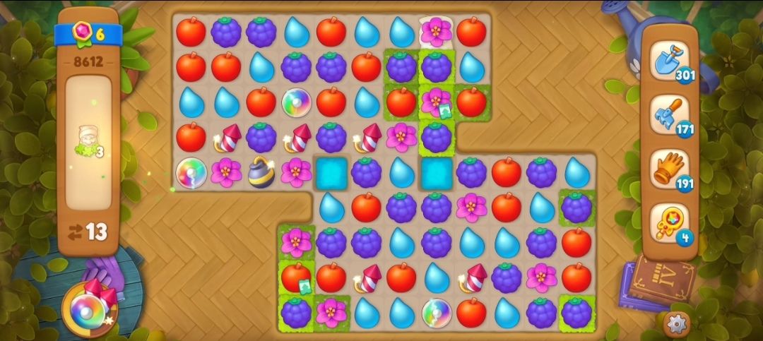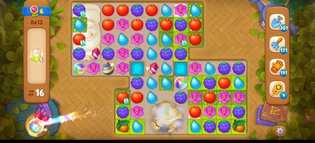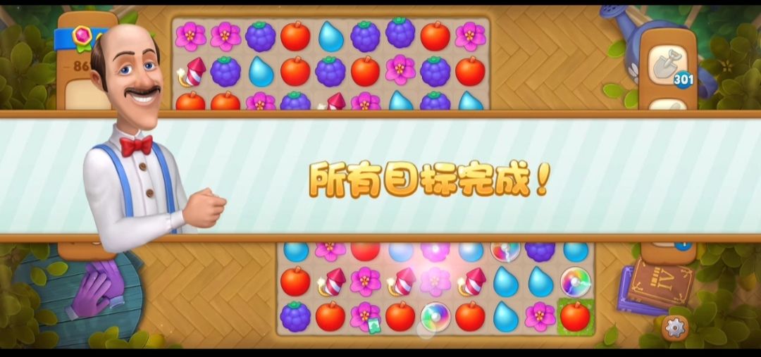 ⑤在密封烟花上面进行元素交换,就可以露出密封烟花,等密封烟花完全出来,就可以飞出来消除两个元素,接下来就在草地上元素匹配消除草地就可以释放出在草地下面的小矮人,可以多多交换元素制造雷管炸弹,说一个小技巧,如果看到有可以适合制造雷管炸弹的元素,可以趁上一次消除元素还没落下来的时候就直接交换,因为落下来之后,元素格局就有可能变动,你们可以去试试的呦。