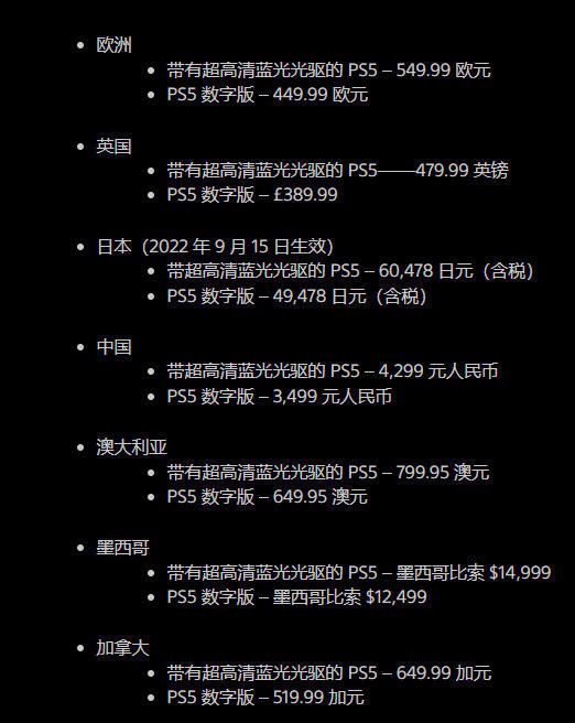 PlayStation官方宣布,受全球经济影响,部分国家和地区的PlayStation 5将会迎来不同程度的涨价。美国地区将不会涨价。