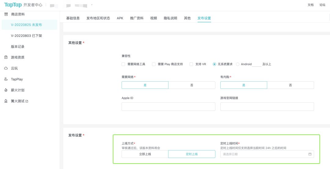 2、支持对版本进行「定时上线」功能,开发者可在【游戏-商店资料-发布设置】模块自主设置当前版本的定时上线时间,要注意的是定时时间仅支持设置当前24h之后的时间,且如果该版本审核通过时间晚于定时时间,则审核通过后,该版本将会直接上线。